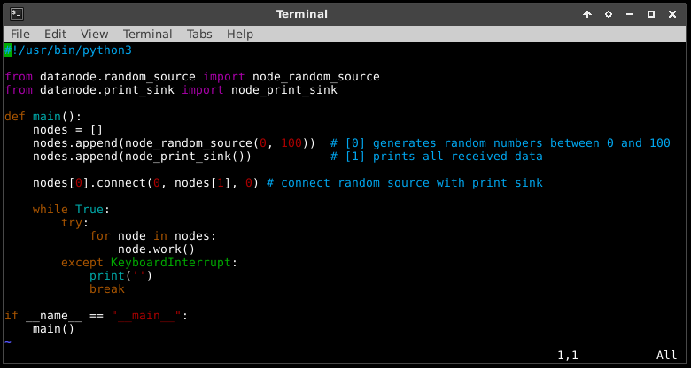 Do you know GNURadio? I really like the idea of connecting blocks that exchange data on links between them to form a data processing system. Out of curiosity how something like this could work, I decided to write something similar and far more low-level from scratch. The result is the python "datanode" module. It is a template class which can be used to implement a data processing functionality into a "node" that can be connected to other nodes. The Package listed below contains some very basic datanodes and an example that demonstrates how to add nodes, connect them and start the execution.